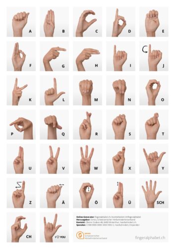 Das Fingeralphabet wird zusätzlich zur Gebärdensprache genutzt, um Begriffe zu buchstabieren. Das Buchstabieren einzelner Buchstaben erfolgt mithilfe jedes einzelnen Fingers.